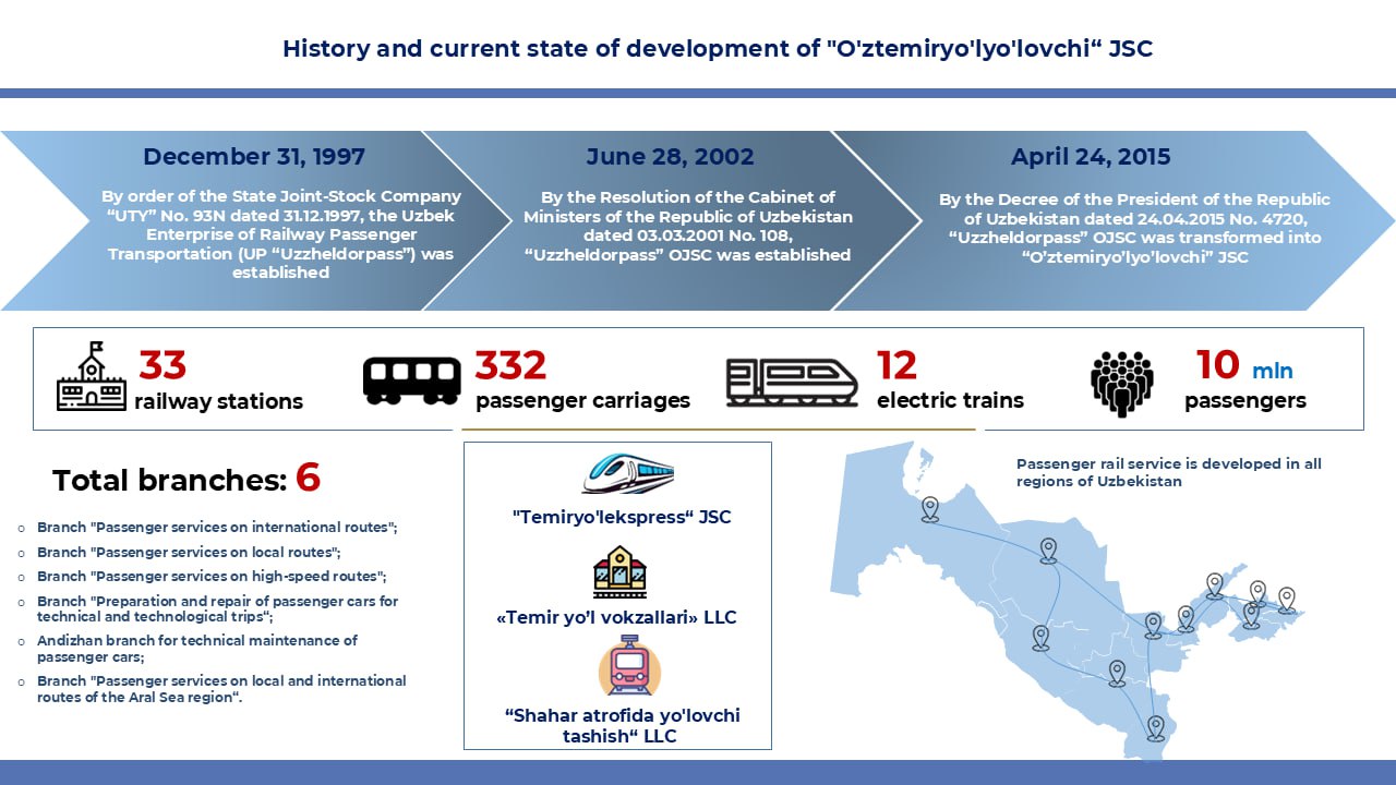 "O'ztemiryo'lyo'lovchi" JSC is constantly improving its services. One of the areas of work is improving the management structure, updating cars and introducing new service systems.