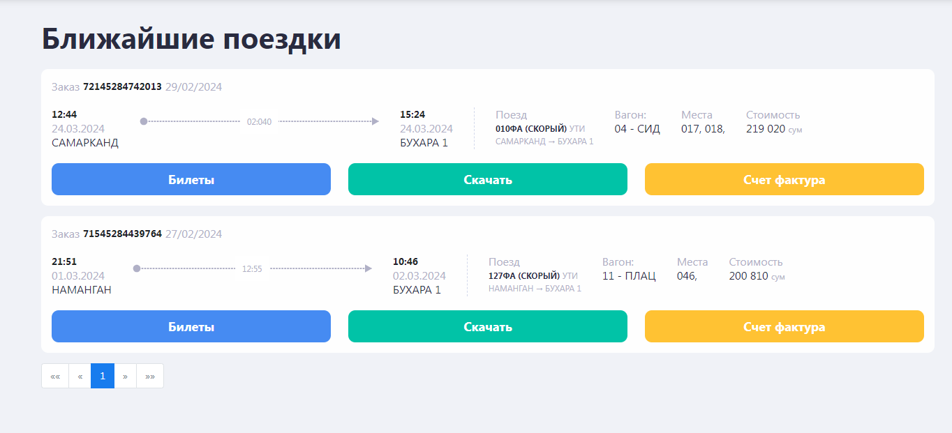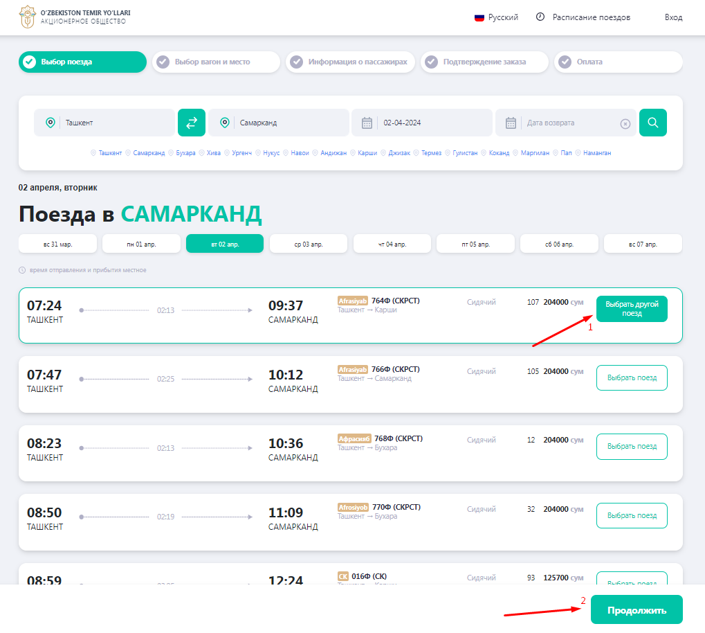 Mavjud poyezdlar ro'yxatidan sizga kerak bo'lgan poyezdni va kerakli vagonlar sinfini tanlaysiz va ekranning pastki qismidagi "VAGON VA JOYNI TANLASH" tugmachasini bosasiz. Foydalanuvchilarga qulay bo'lishi uchun, tanlangan sanadagi barcha poyezdlarning mavjud joylari va chiptalarning narxlari ko'rsatilgan.