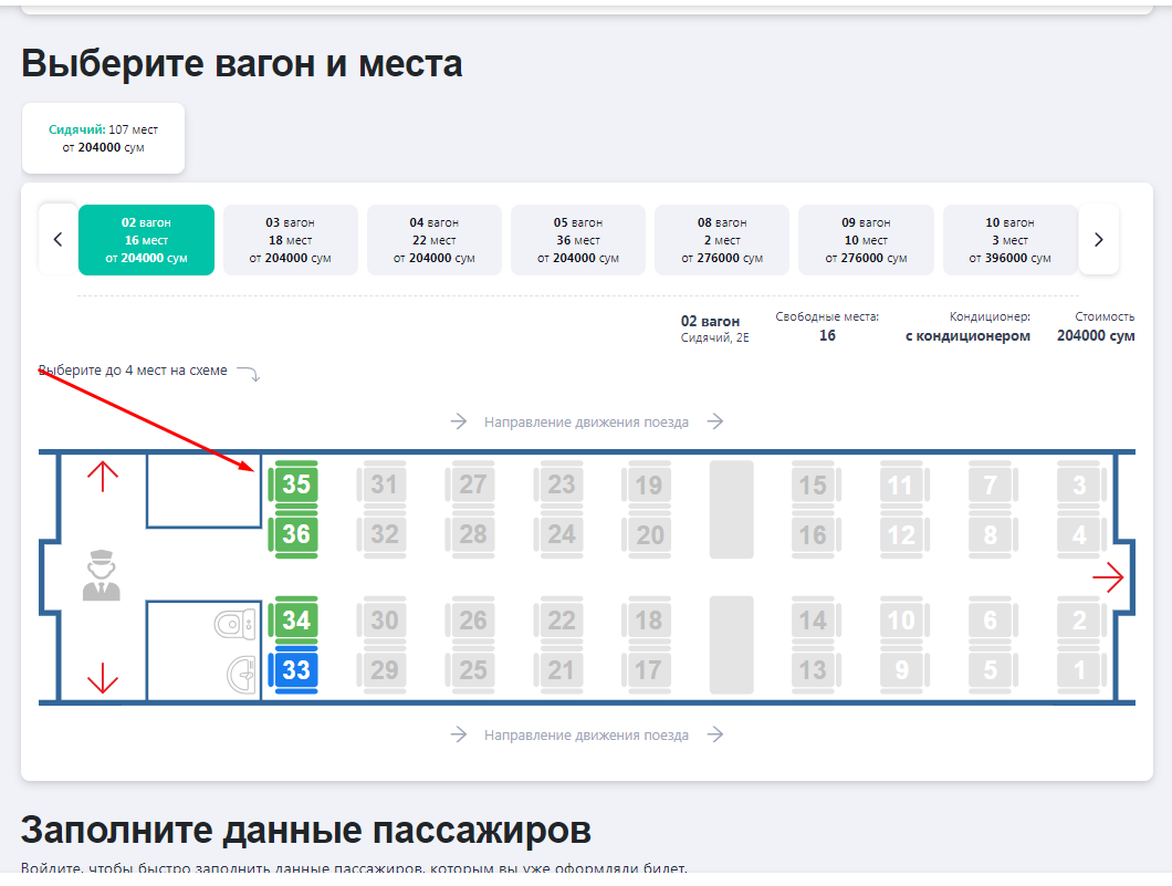 Keyin vagon sxemasidan joy tanlanadi (yorug' rang - bo’sh, to’q rang - sotilgan, tanlangan joy - yashil). Shuningdek, qulaylik yaratish maqsadida qo'shimcha xizmatlar ko'rsatiladi: qo'shimcha ovqat va choyshablar.