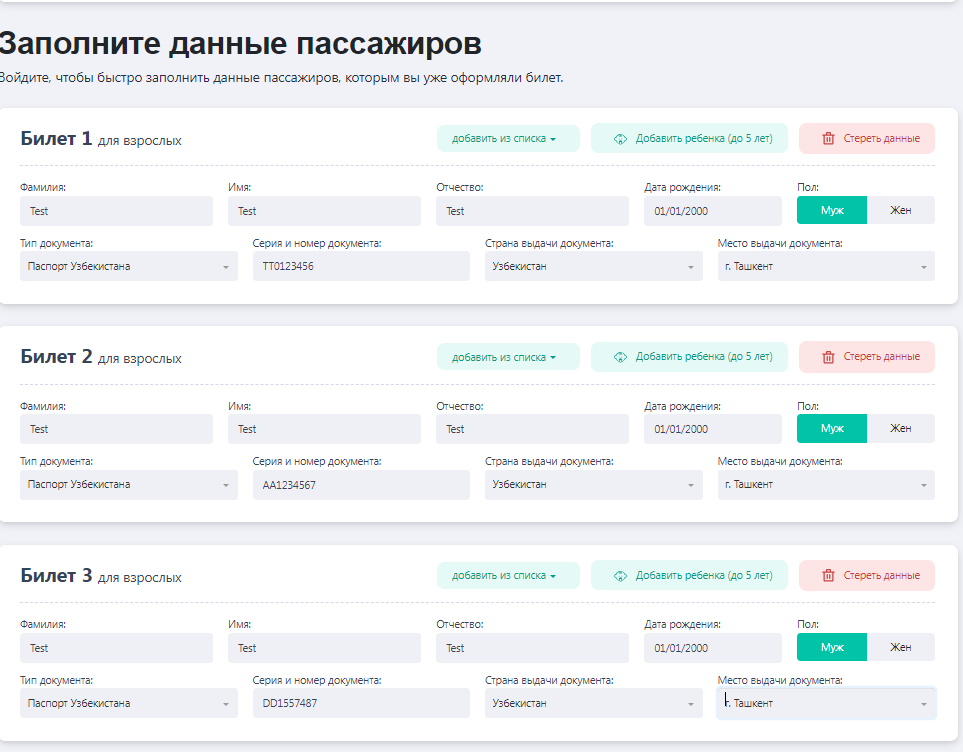 Joy tanlagandan so'ng, foydalanuvchi shaxsiy pasport ma'lumotlarini to'ldiradi va barcha kerakli ma'lumotlarni tegishli darchalarga kiritadi. Agar kerak bo'lsa, siz "bolani qo'shish" -tugmasini tanlashingiz mumkin. Elektron yo'l hujjatlari 10 yoshgacha bo'lgan katta yoshli bolalarni alohida o'rindiq bilan, shuningdek 5 yoshgacha bo'lgan bolalarni bepul asosda va alohida joyni egallamasdan olib yurish uchun beriladi. Bundan tashqari, agar kerak bo'lsa, siz yana 3 yo'lovchiga joy tanlashingiz va barcha kerakli ma'lumotlarni kiritishingiz mumkin.
