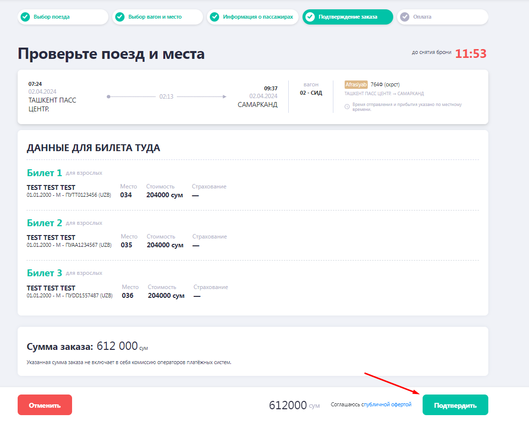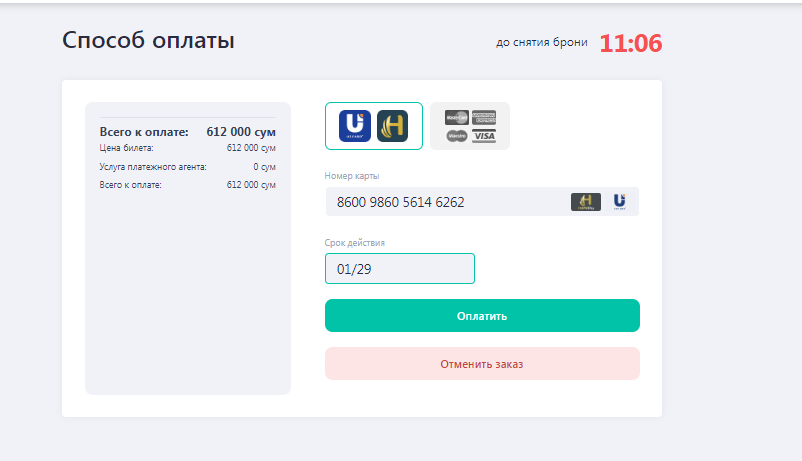 Diqqat! 3 va 4- bosqichlarni bosib o'tishga 10 daqiqa vaqt beriladi. Agar yo'lovchi bu vaqt davomida to’lovni amalga oshirmasa, buyurtma bekor qilinadi